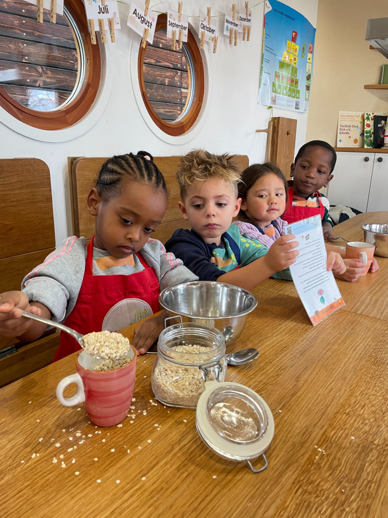 An dieser besonderen Einrichtung gab es leckere Apfelwaffeln und knusprige Vollkornbrötchen. Mit viel Freude, vollem Einsatz und großer Neugier waren die Kinder bei der Sache – dabei blieb es natürlich nicht aus, dass auch jede Menge Mehl an den Fingern landete. Die Kinder hatten großen Spaß am Zubereiten, Ausprobieren und Mithelfen, und unsere Rezepte kamen bei allen richtig gut an. Bei passendem Wetter konnte das selbst zubereitete Essen anschließend gemeinsam draußen an der frischen Luft genossen werden, was den Vormittag zu einem besonders schönen und gelungenen Erlebnis machte.