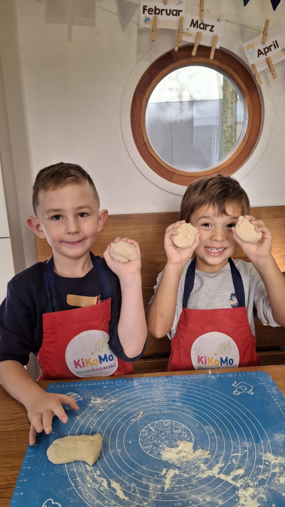 In der Projektwoche wurde das KiKoMo im KiFaZ Oberreut erneut zum Treffpunkt für viele Kinder aus den umliegenden Kitas. Gemeinsam backten sie Vollkornkekse – besonders das Kneten des Teigs sorgte für viel Begeisterung, Lachen und lebendige Kochmomente.