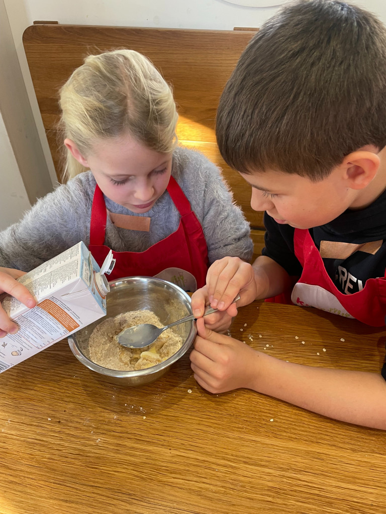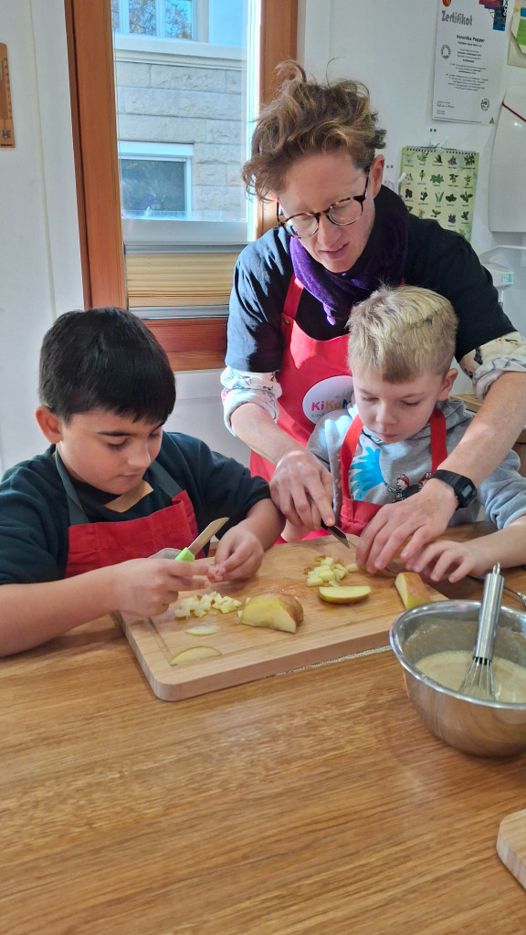 In Zweiergruppen bereiteten die Kinder ihre Pfannkuchen eigenständig zu – vom Abmessen der Zutaten über das Schneiden der Äpfel bis hin zum Ausbacken in der Pfanne. Dabei übernahmen sie viel Verantwortung, trafen gemeinsam Entscheidungen und erlebten ganz praktisch, wie gut Teamarbeit funktionieren kann.