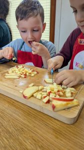 Beim Apfelschneiden dürfen die Kinder probieren und beschreiben: